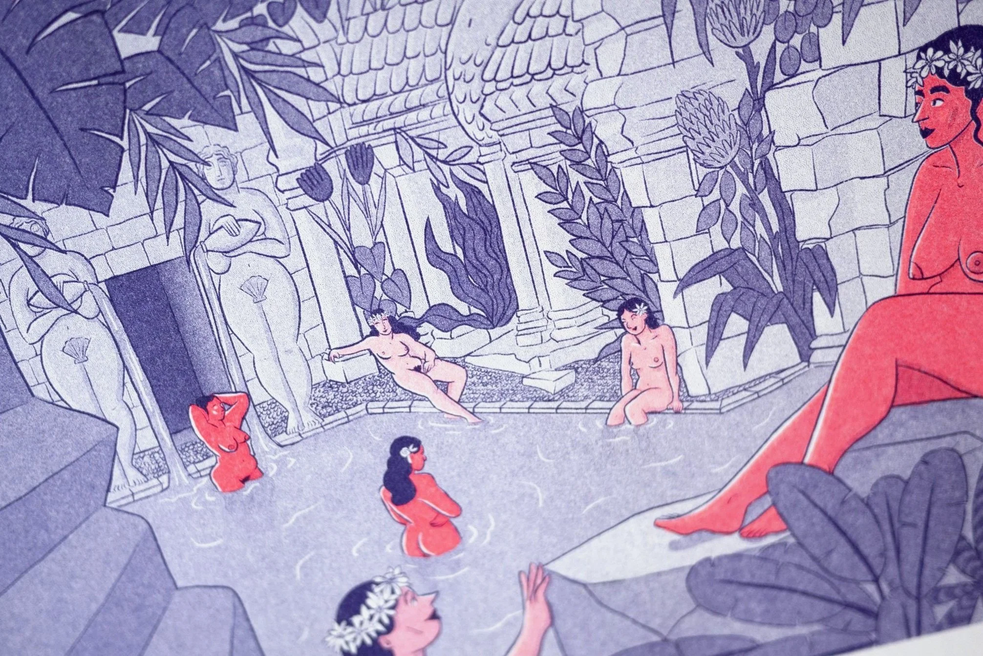 De la sérigraphie à la risographie, du dessin numérique à la poterie, j’aime multiplier les techniques pour donner une dimension tangible à des idées vastes, et faire voyager mes images entre le papier, la matière et le volume.